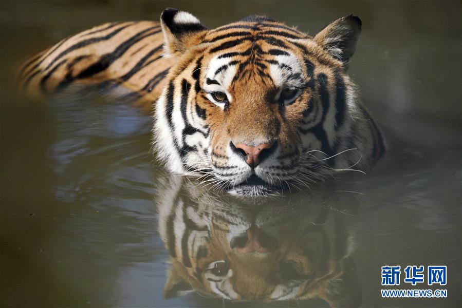 7月28日,在横道河子东北虎林园,东北虎在水中纳凉。 时值盛夏,位于黑龙江省海林市的横道河子东北虎林园的东北虎活动量减少,以不同方式消夏纳凉。 新华社记者 王建威 摄