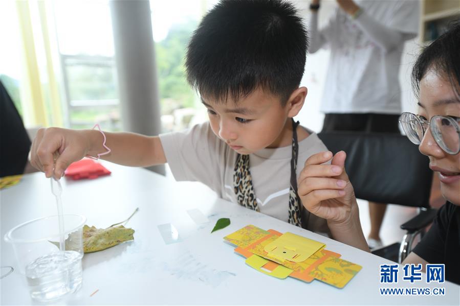 7月27日,小朋友在制作植物标本。 当日,位于浙江湖州吴兴区道场乡的梁希国家森林公园举办了一场别开生面的研学活动,小朋友们在导师的带领下参加以显微镜为主题的自然生态研学课程,学习植物知识和标本制作等,了解大自然。新华社记者 翁忻旸 摄