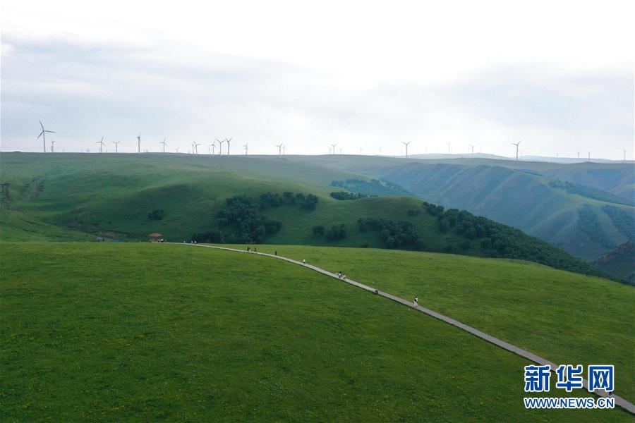 7月30日,游客在辉腾锡勒(黄花沟)草原旅游区游玩(无人机照片)。新华社记者 徐钦 摄