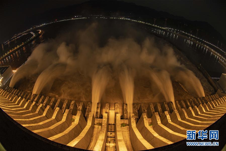 7月31日晚拍摄的三峡大坝泄洪景象。 入夜,三峡工程景观灯开放,整个景区更加壮丽多彩。 新华社记者 杜华举 摄