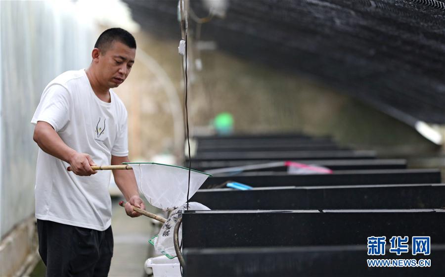 8月4日,张忠堡村村民李国鹏在自家观赏鱼养殖池里捞鱼。 新华社记者 姚剑锋 摄