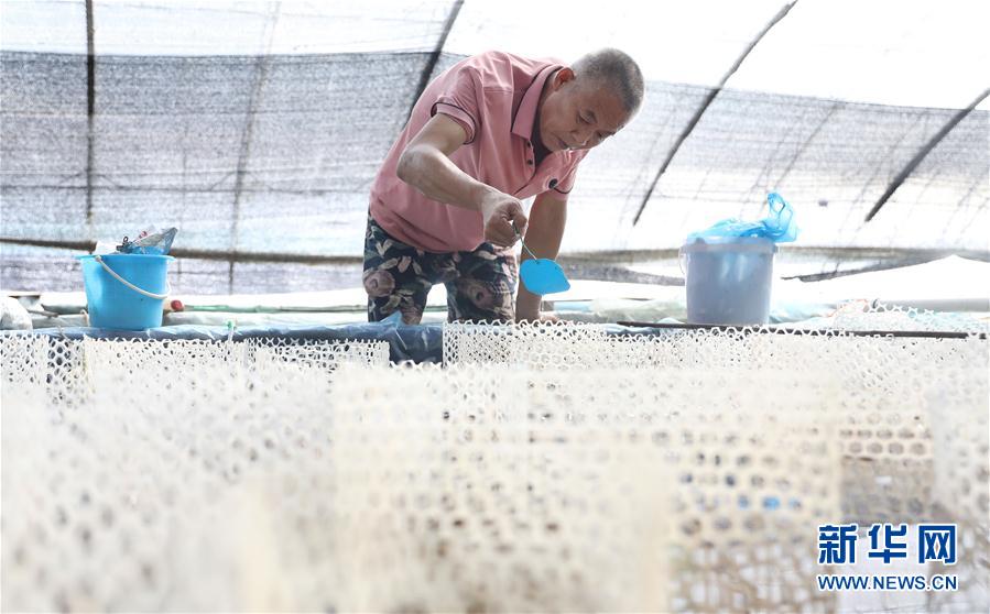 8月4日,张忠堡村村民赵世龙在观察育种筐里的观赏鱼排卵状况。新华社记者 姚剑锋 摄