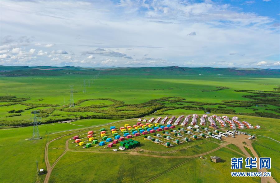 这是呼伦贝尔陈巴尔虎旗天下草原游牧部落一景(8月3日摄,无人机照片)。 今年暑期,内蒙古呼伦贝尔通过暂行周末2.5天弹性休假工作制度,发放旅游、餐饮消费券,景区推出优惠促销活动等措施,提振当地旅游市场。 新华社记者 徐钦 摄