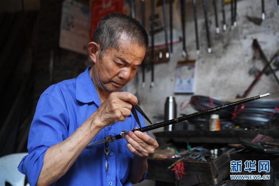 8月5日,丰盛古镇经营秤杆店的居民王泽喜在制作秤杆。 近年来,重庆市巴南区引入社会资本,按照“修旧如旧、适度开发”的原则对丰盛古镇进行保护性修缮和景区化打造,让古镇在保留原有历史人文风貌的同时,焕发新活力。 新华社记者 王全超 摄