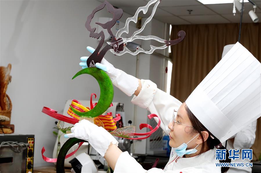 8月5日,糖艺比赛参赛选手在创作中。 当日,第二十一届全国焙烤职业技能竞赛上海赛区选拔赛,在上海市现代食品职业技能培训中心举行,来自上海、江苏、浙江等地的近60名焙烤行业技师,在艺术面包、传统糕点、糖艺和艺术巧克力等项目中进行比拼,在充满焙烤香气的赛场上展现技艺。 新华社记者方喆摄