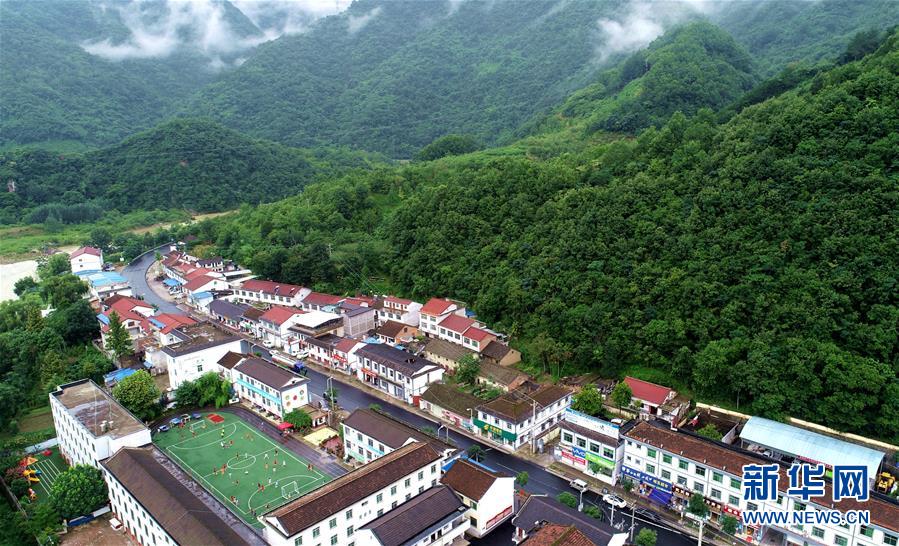 8月4日,陕西省留坝县的小球员们在位于秦岭南麓的武关驿镇中心小学进行足球暑期集训(无人机照片)。