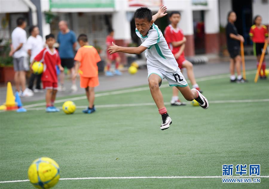 8月4日,陕西省留坝县的小球员陈昊天在位于秦岭南麓的武关驿镇中心小学进行足球暑期集训。新华社记者 李一博 摄