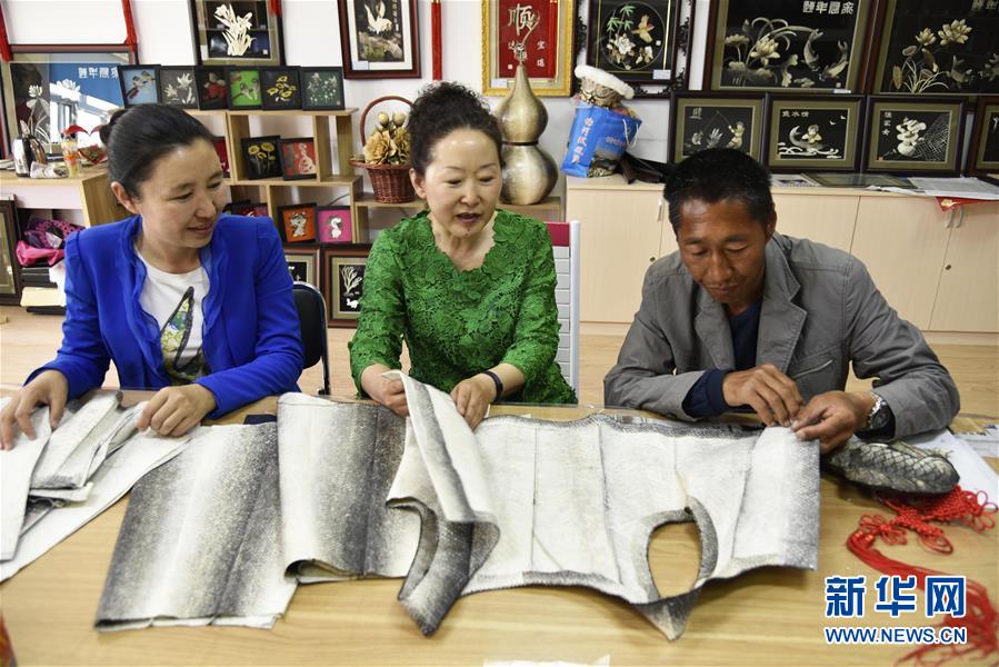 帮扶人董丽娟(左一)带李春喜去鱼皮技艺传承人王桂荣(中)的工作室学习(2018年6月2日摄)。新华社发