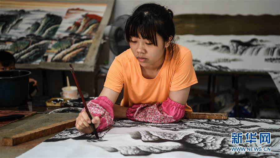 8月6日,在桂林市临桂区五通镇,一名画师在自己的工作室里创作。 近年来,广西桂林市临桂区五通镇以“公司+贫困户+画师”的模式,大力推动“农民画”产业发展。目前,五通镇“农民画”从业者已达5000多人,“农民画”已成为当地农民增收的新产业。 新华社记者 张爱林 摄