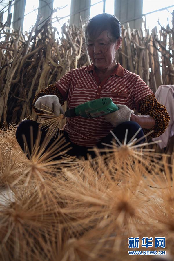 8月7日,工人利用柑橘树枝加工吊灯饰品。 2017年以来,广西桂林市永福县永安乡通过帮扶返乡青年创业的方式,建立起根雕工艺品就业扶贫车间,组织贫困群众进车间务工学艺,把当地丰富的朽木和柑橘树根枝资源利用起来,加工成盆景、茶桌、吊灯等根雕工艺品,不仅帮助贫困群众在家门口掌握一技之长,还让他们在脱贫摘帽后实现稳定增收。 新华社记者 张爱林 摄