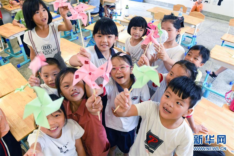 8月7日,孩子们在教室的风扇下让风车转动起来。 当日,浙江省慈溪市钱海军志愿服务中心的青年志愿者们来到慈溪市匡堰镇中心小学,开展“星星点灯”暑期课堂进乡村活动,为暑期集中在这里的“小候鸟”们带去知识与欢乐。每年暑假,该志愿服务中心“星星点灯”大课堂公益项目的志愿者们都会走进慈溪各个村社,为来自异乡的孩子送上种类多样的暑期趣味课程,让他们拥有一个充实快乐的暑期生活。 新华社记者 徐昱 摄