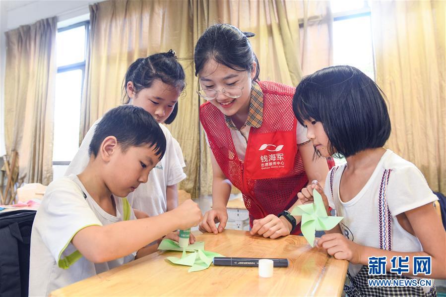 8月7日,青年志愿者与孩子们一起制作风车。 当日,浙江省慈溪市钱海军志愿服务中心的青年志愿者们来到慈溪市匡堰镇中心小学,开展“星星点灯”暑期课堂进乡村活动,为暑期集中在这里的“小候鸟”们带去知识与欢乐。每年暑假,该志愿服务中心“星星点灯”大课堂公益项目的志愿者们都会走进慈溪各个村社,为来自异乡的孩子送上种类多样的暑期趣味课程,让他们拥有一个充实快乐的暑期生活。 新华社记者 徐昱 摄