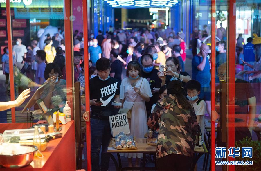 8月8日晚,市民在望京小街商业街购买小吃。 当日,作为北京消费季活动的一部分,北京市朝阳区的“潮朝阳”消费季活动正式重启,位于朝阳区的新兴商业街望京小街举办开街嘉年华活动。 新华社记者 陈钟昊 摄