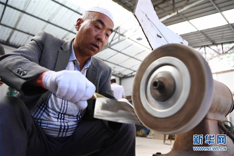 8月10日,甘肃省临夏回族自治州积石山县大河家镇的村民马得胜在制作保安腰刀。新华社记者 陈斌 摄