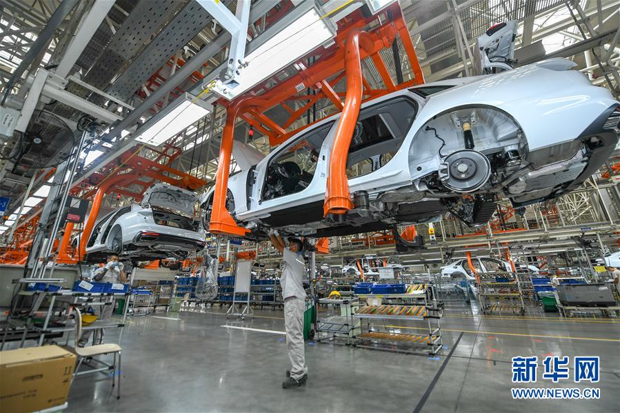 8月10日,在一汽-大众长春基地总装车间,工人在装配车辆。 中国第一汽车集团有限公司7月销售整车32.2万辆,同比增长23.2%,延续上半年的增长态势。 新华社记者 张楠 摄