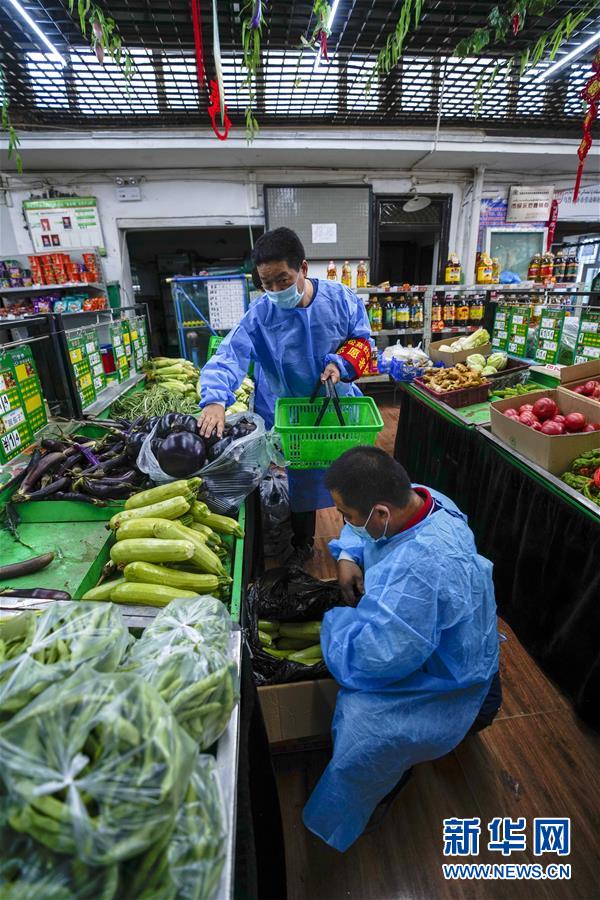 在乌鲁木齐市沙依巴克区扬子江街道青松苑社区蔬菜直销点,陈金奇(前)帮助为小区居民采买的志愿者按照网络订单挑选蔬菜(8月8日摄)。新华社记者 赵戈 摄