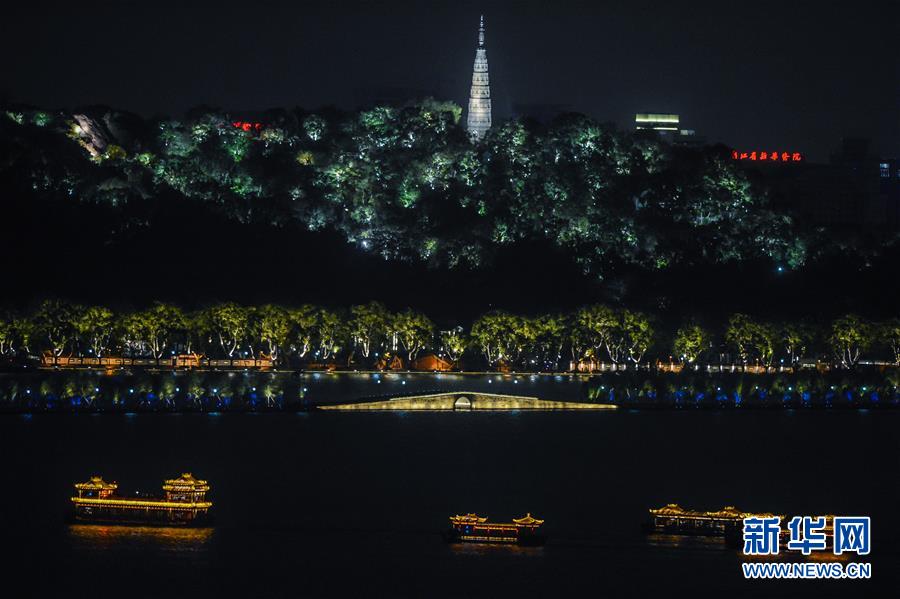 游船行驶在夜色中的西湖湖面上(2016年9月4日摄)。 新华社记者 徐昱 摄