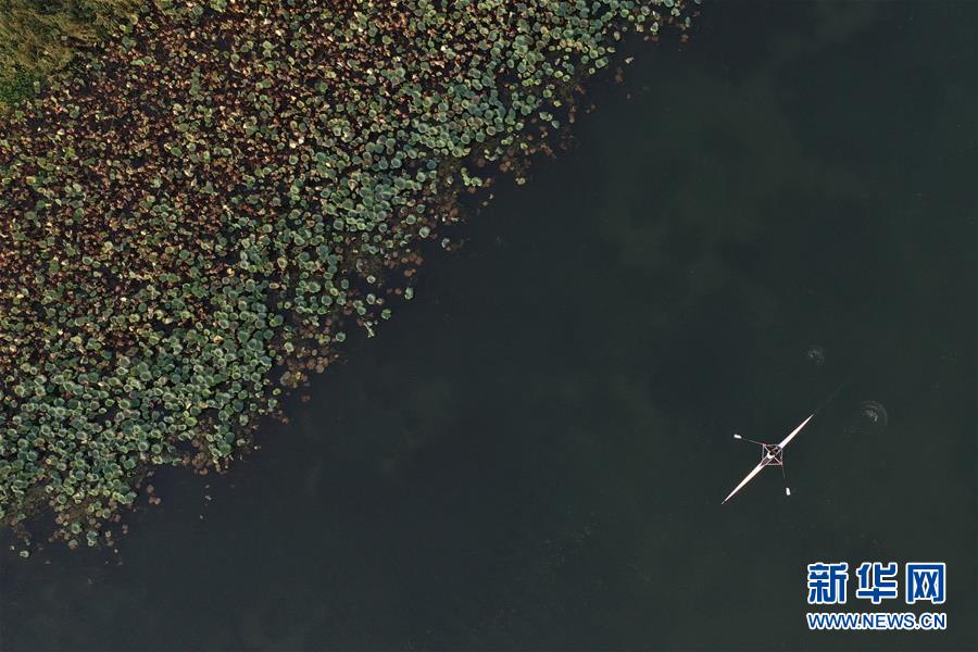一艘皮划艇从杭州西湖景区的一处荷花池附近经过(2019年10月29日摄,无人机照片)。 新华社记者 黄宗治 摄