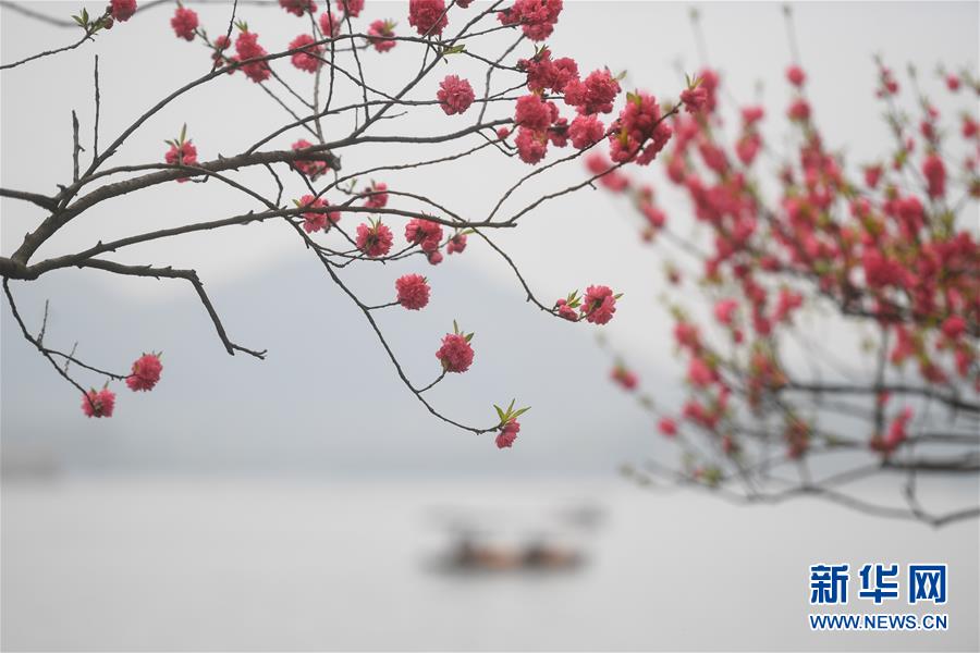 杭州西湖景区白堤上的桃花(2019年4月2日摄)。 新华社记者 黄宗治 摄