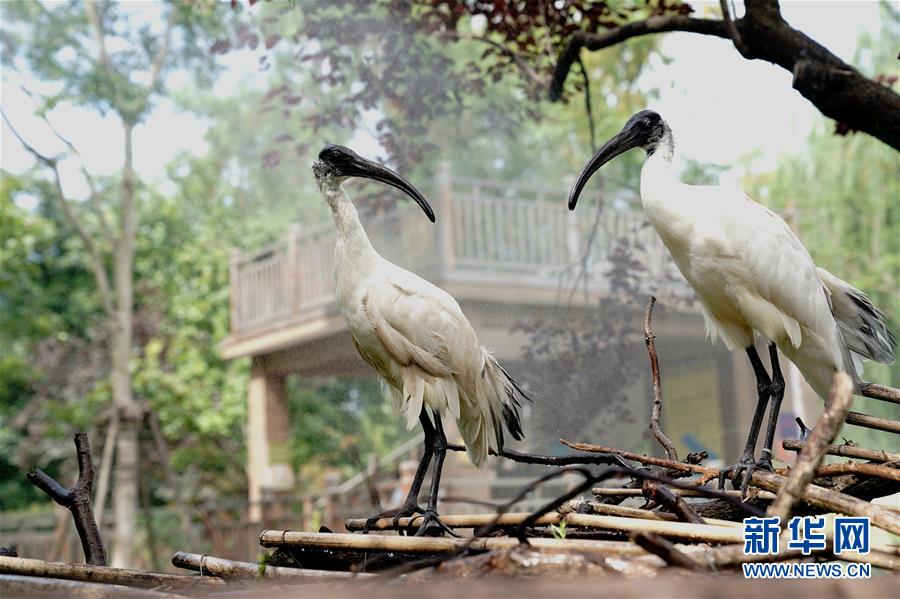8月11日,上海动物园的两只白鹮在享受喷淋降温。 当日,上海最高温度达到35摄氏度,上海动物园开启园内安装的各种喷淋装置,让动物们防暑降温,乐享清凉。 新华社记者 张建松 摄