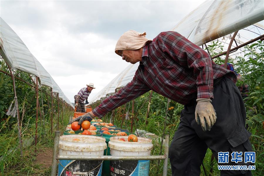 8月11日,在宁安市庆雨蔬菜专业合作社蔬菜产业园基地,工人把刚采摘下来的西红柿装入桶中准备运走。 近年来,黑龙江省宁安市把设施蔬菜作为精准扶贫的主导产业来抓,组织吸纳贫困户贷资加入产业合作社,带动贫困户脱贫增收。宁安市将全市500余户贫困户的小额信贷资金集中投放到宁安市庆雨蔬菜专业合作社,建设蔬菜产业园基地,在带动贫困户脱贫增收的同时,壮大合作社蔬菜产业。 新华社记者王建威摄