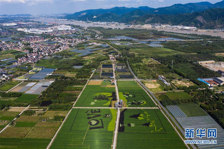 这是东洲街道红旗村的“艺术稻田”水稻画(8月12日摄,无人机照片)。 进入8月中旬,浙江省杭州市富阳区东洲街道红旗村的300亩“艺术稻田”里的水稻画进入最佳观赏期。“葡萄美酒”“牛郎织女”“稻田插秧”等特色图案成了当地乡村旅游的亮点。近年来,杭州市富阳区东洲街道积极推动美丽田园建设,打造以乡村旅游、农事采摘、农家乐民宿为主题的乡村文旅融合发展之路。 新华社记者 徐昱 摄