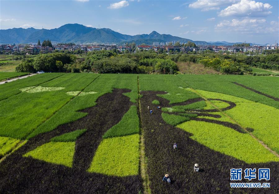 空中俯瞰东洲街道红旗村的“艺术稻田”水稻画“牛郎织女”(8月12日摄,无人机照片)。 进入8月中旬,浙江省杭州市富阳区东洲街道红旗村的300亩“艺术稻田”里的水稻画进入最佳观赏期。“葡萄美酒”“牛郎织女”“稻田插秧”等特色图案成了当地乡村旅游的亮点。近年来,杭州市富阳区东洲街道积极推动美丽田园建设,打造以乡村旅游、农事采摘、农家乐民宿为主题的乡村文旅融合发展之路。 新华社记者 徐昱 摄