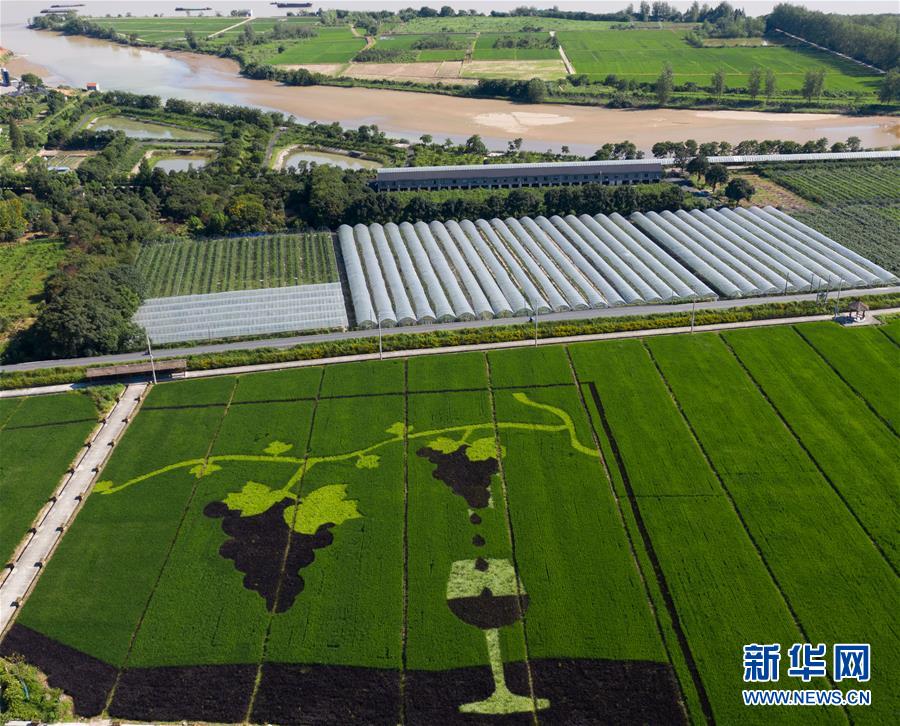 空中俯瞰东洲街道红旗村的“艺术稻田”水稻画“葡萄美酒”,旁边就是当地的葡萄种植大棚(8月12日摄,无人机照片)。 进入8月中旬,浙江省杭州市富阳区东洲街道红旗村的300亩“艺术稻田”里的水稻画进入最佳观赏期。“葡萄美酒”“牛郎织女”“稻田插秧”等特色图案成了当地乡村旅游的亮点。近年来,杭州市富阳区东洲街道积极推动美丽田园建设,打造以乡村旅游、农事采摘、农家乐民宿为主题的乡村文旅融合发展之路。 新华社记者 徐昱 摄
