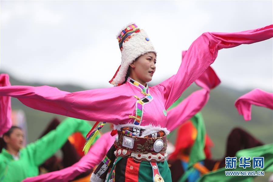 8月12日,演员在开幕式上表演舞蹈。 当日,2020中国碌曲锅庄舞展演暨甘南藏族自治州第六届少数民族传统体育运动会在甘肃省甘南州碌曲县夏泽滩草原上举行。开幕式上,三千余名身着节日盛装的演员和当地群众在草原上起舞,雨后初晴的草原上充满欢声笑语。 新华社记者 耿馨宁 摄