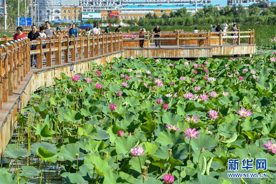 这是在镇赉环城国家湿地公园拍摄的荷花(8月12日摄)。 近日,位于吉林省白城市镇赉县的镇赉环城国家湿地公园荷花进入盛放期,吸引市民前来观赏。公园湖泡原址是县城污水排放点,水质富营养化,污染较为严重,2013年起,镇赉县先后实施了湖泡连通、湿地清淤、围堰保护、水污染综合治理、植被恢复等生态保护工程,使湿地公园成为了集城市生态治理、环保科普教育、市民休闲娱乐于一体的生态功能区。 新华社记者 张楠 摄