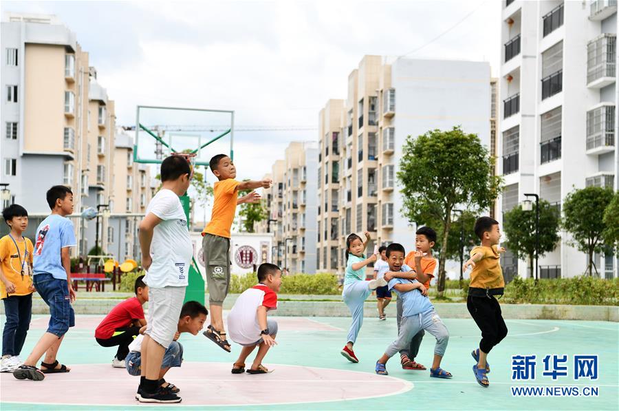 8月13日,在贵州省思南县双塘街道丽景社区易地扶贫搬迁安置点,孩子们和志愿者在丢沙包。新华社记者 杨文斌 摄