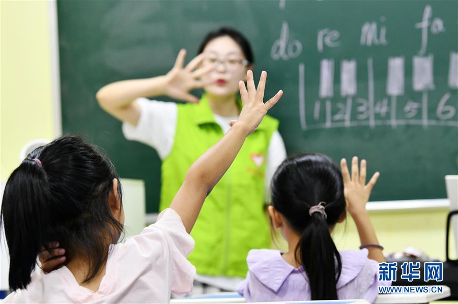 8月13日,在贵州省思南县双塘街道丽景社区易地扶贫搬迁安置点,志愿者在给孩子们上音乐课。 今年暑假期间,在贵州省铜仁市思南县双塘街道丽景社区易地扶贫搬迁安置点,来自北京有研集团和思南当地的志愿者们利用暑期时间,给安置点的孩子们进行音乐、体育、手工、安全教育等课程辅导,帮助搬迁户照看孩子,让孩子们在学习中度过一个快乐而有意义的暑假。 新华社记者 杨文斌 摄