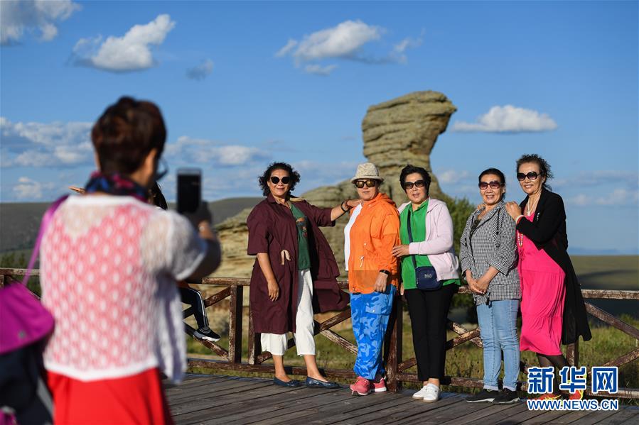 游客在克什克腾石阵景区拍照留影(8月11日摄)。 克什克腾旗位于内蒙古自治区赤峰市西北部,境内的湖泊、河流、草原、森林等自然景观,让人们流连忘返。 新华社记者 刘磊 摄