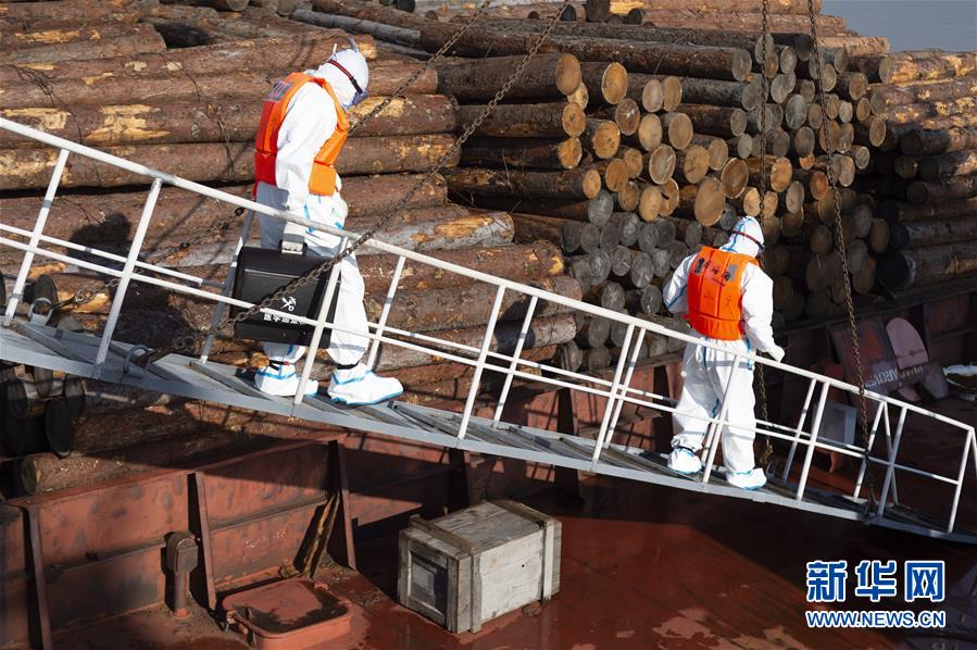 8月13日,在黑龙江抚远口岸货检现场,工作人员对俄籍进境船舶进行登临检疫。 新华社记者 谢剑飞 摄