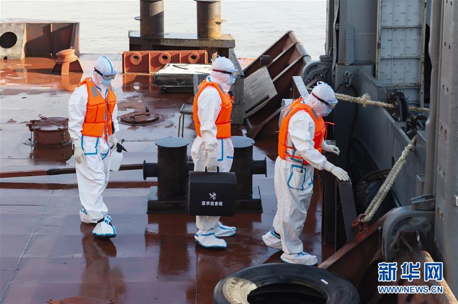 8月13日,在黑龙江抚远口岸货检现场,工作人员对俄籍进境船舶进行登临检疫。新华社记者 谢剑飞 摄
