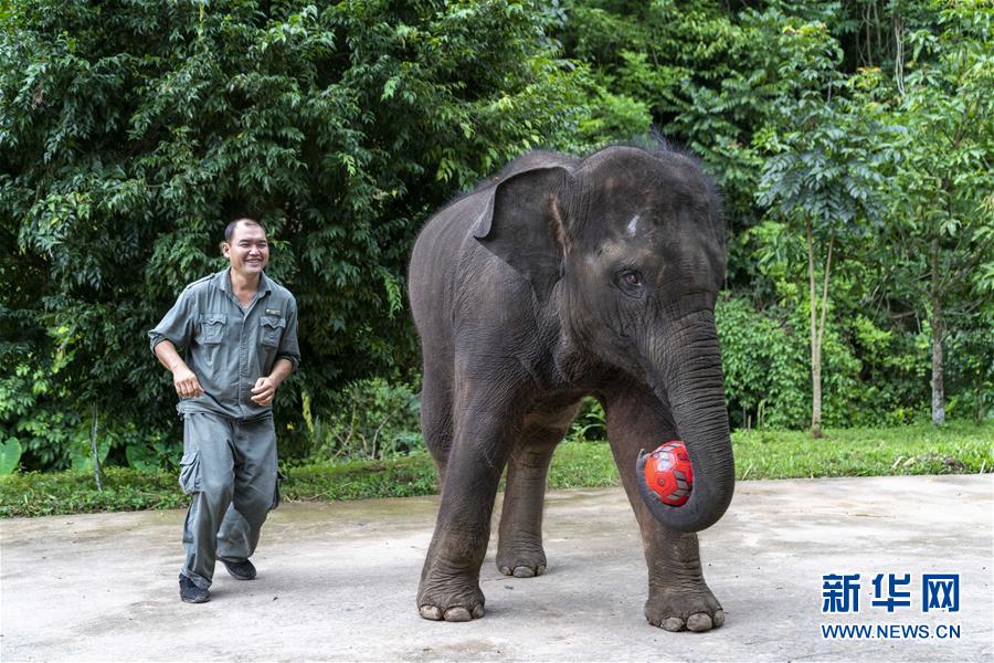 8月12日,在西双版纳傣族自治州亚洲象种源繁育及救助中心,救助象“羊妞”在生日会上与一名“象爸爸”玩皮球。 新华社记者 陈欣波 摄