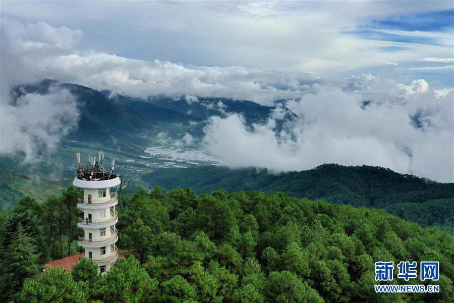 邛海泸山国家级风景名胜区掩映在云雾中(8月13日摄,无人机照片)。 新华社记者 李贺 摄 |