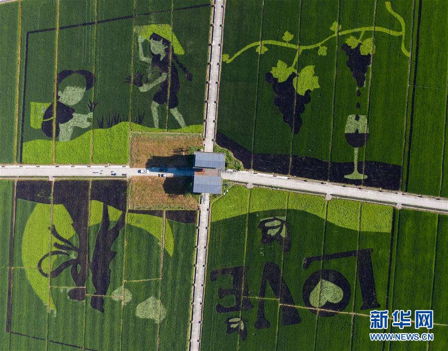 这是东洲街道红旗村的“艺术稻田”水稻画(8月12日摄,无人机照片)。 进入8月中旬,浙江省杭州市富阳区东洲街道红旗村的300亩“艺术稻田”里的水稻画进入最佳观赏期。“葡萄美酒”“牛郎织女”“稻田插秧”等特色图案成了当地乡村旅游的亮点。近年来,杭州市富阳区东洲街道积极推动美丽田园建设,打造以乡村旅游、农事采摘、农家乐民宿为主题的乡村文旅融合发展之路。 新华社记者 徐昱 摄