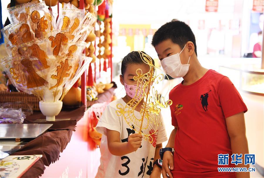 8月8日,两名小朋友在第十八届中关村国际美食节美食美酒嘉年华文创非遗展示区感受糖画魅力。新华社记者 任超 摄