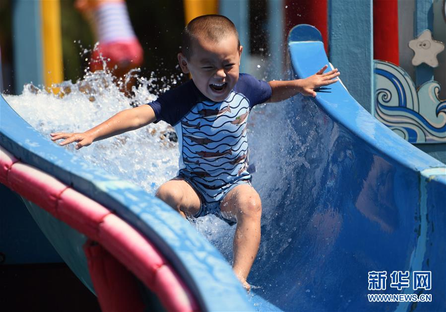 8月9日,一名小朋友在南宫五洲植物乐园户外戏水区游玩。 近期,在做好新冠肺炎疫情防控的前提下,位于北京市丰台区的南宫五洲植物乐园户外戏水区对外开放。市民在戏水的同时还可以在沙滩上画沙画、在新游乐项目“丛林网绳”里穿梭跳跃,丰富暑期生活。 新华社记者 任超 摄