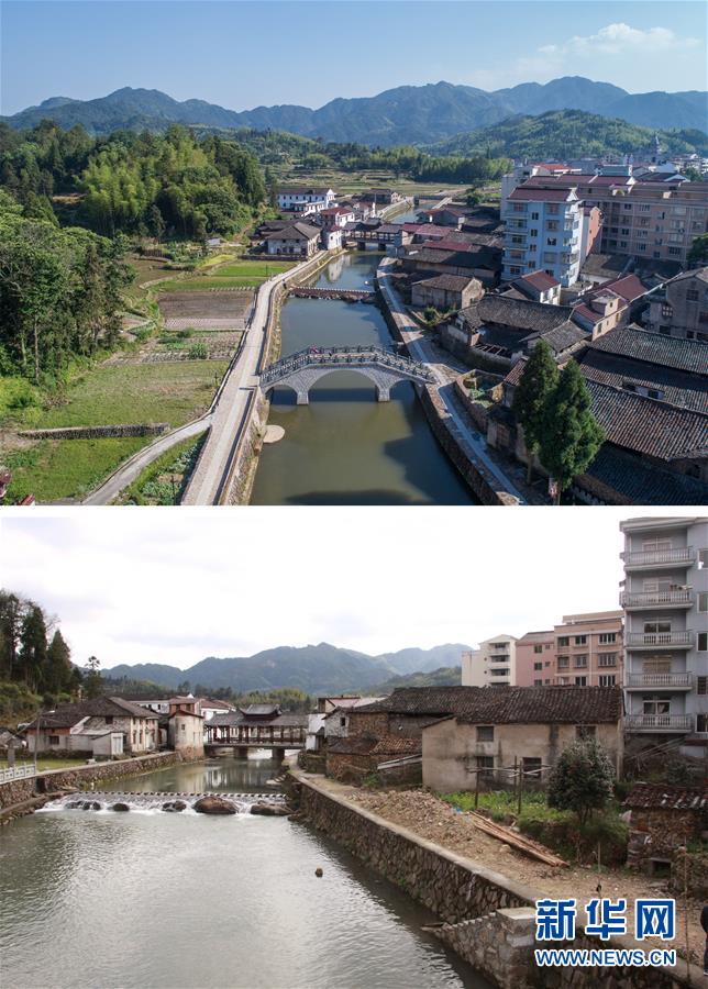 拼版照片:上图为2019年5月23日拍摄的浙江省青田县阜山乡的玉带溪两岸整洁美丽的山乡美景(无人机照片);下图为2018年3月21日拍摄的改造前阜山乡景象。 新华社记者 徐昱 摄