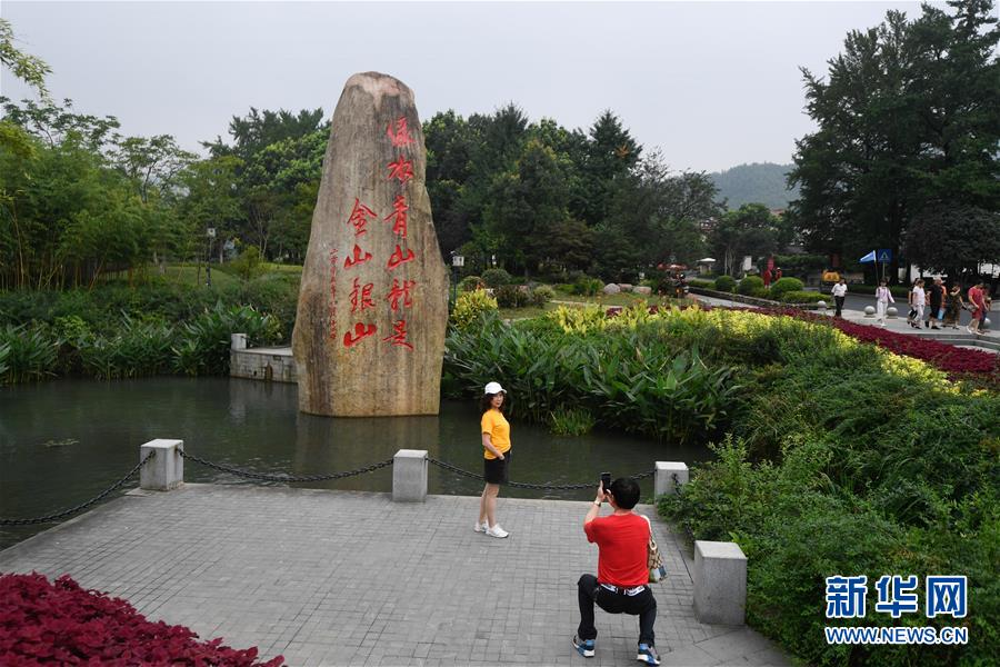游客在浙江省安吉县天荒坪镇余村留影(7月28日摄)。 新华社记者 黄宗治 摄