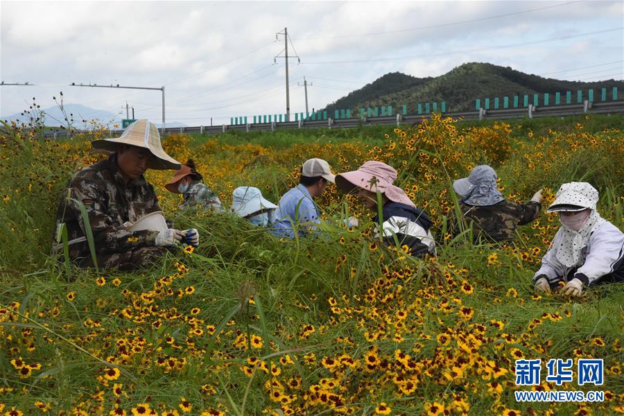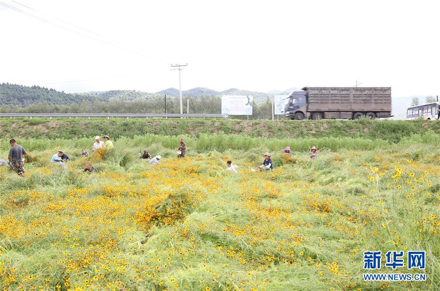 在黑龙江省伊春市南岔县一处药材基地,林宝药业集团的“产业农民”在采摘中草药(8月12日摄)。 新华社记者 管建涛 摄