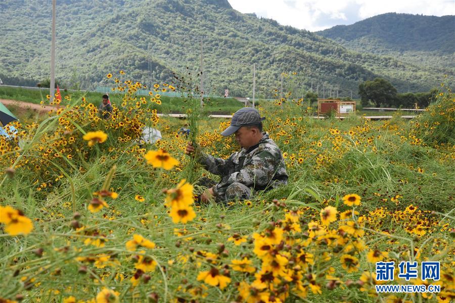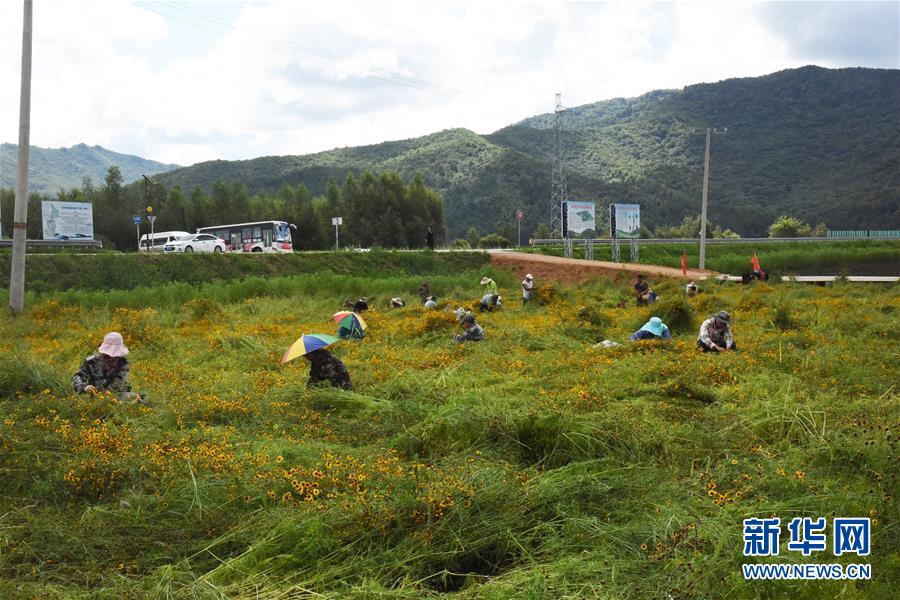 8月12日,在黑龙江省伊春市南岔县一处药材基地,林宝药业集团的“产业农民”在采摘中草药。新华社记者 杨喆 摄