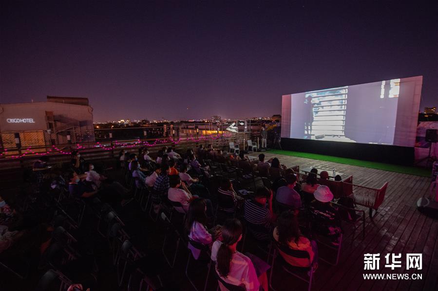 8月24日,观众在南锣书店露台欣赏露天电影。新华社记者 陈钟昊 摄