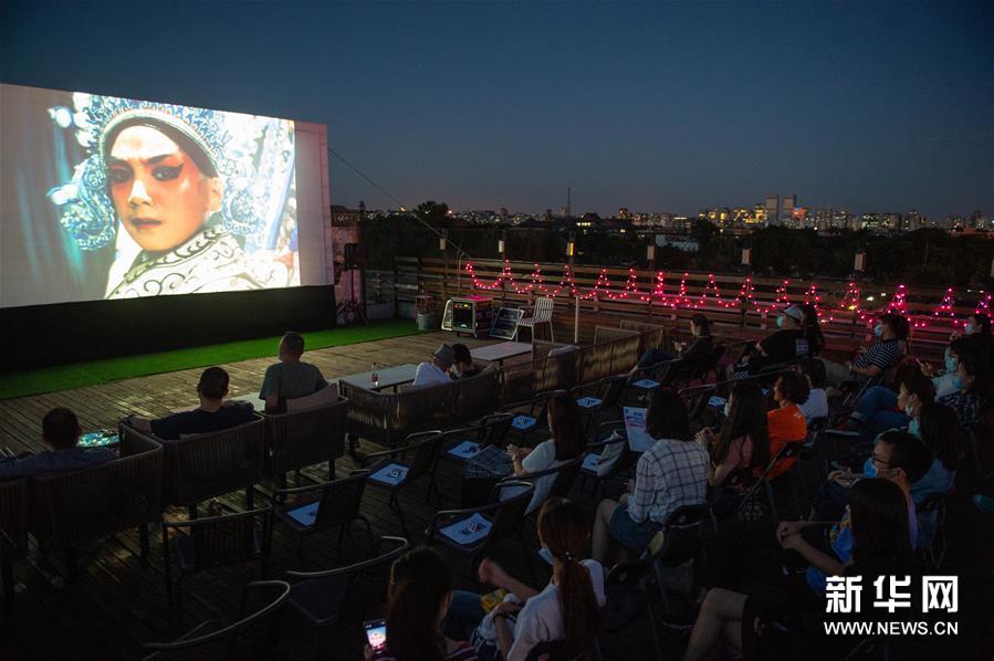 8月24日,观众在南锣书店露台欣赏露天电影。新华社记者 陈钟昊 摄