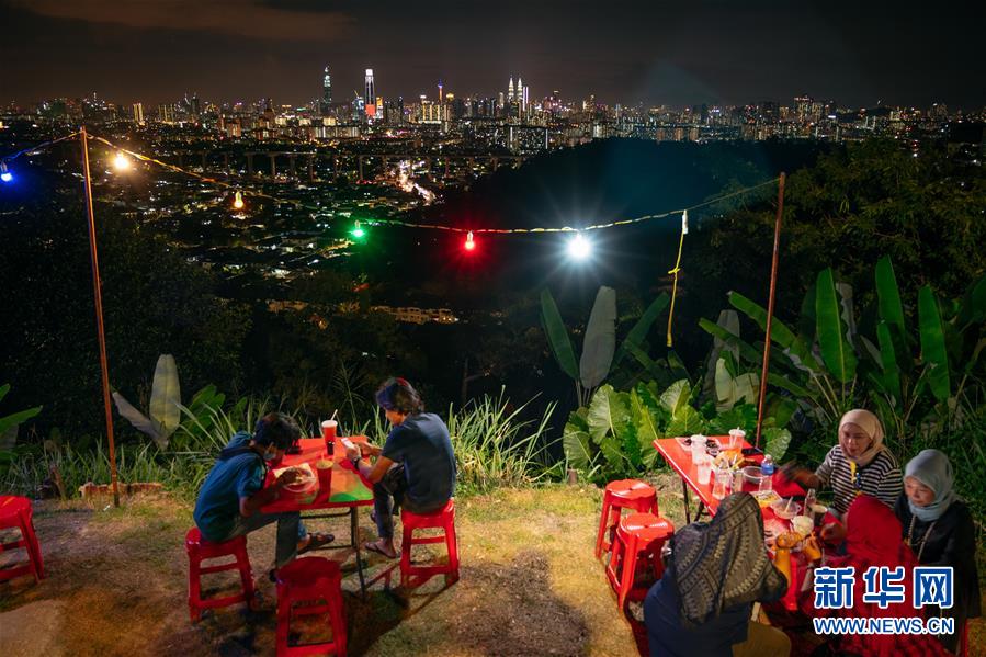 这是2020年8月24日,人们在马来西亚吉隆坡附近一处路边摊用餐,远处是城市的夜景。 新华社记者 朱炜 摄