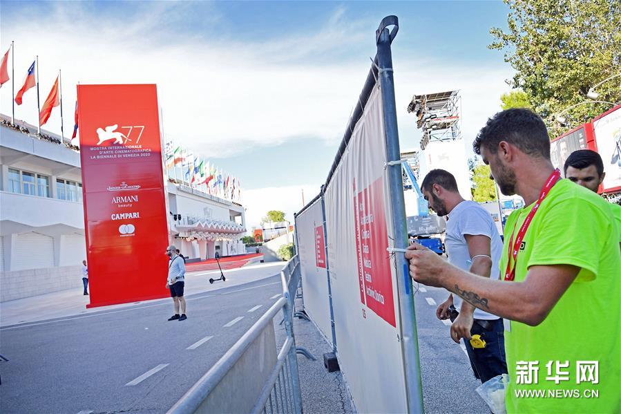 9月1日,工作人员在意大利威尼斯利多岛为第77届威尼斯电影节开幕做最后准备。新华社/西霸
