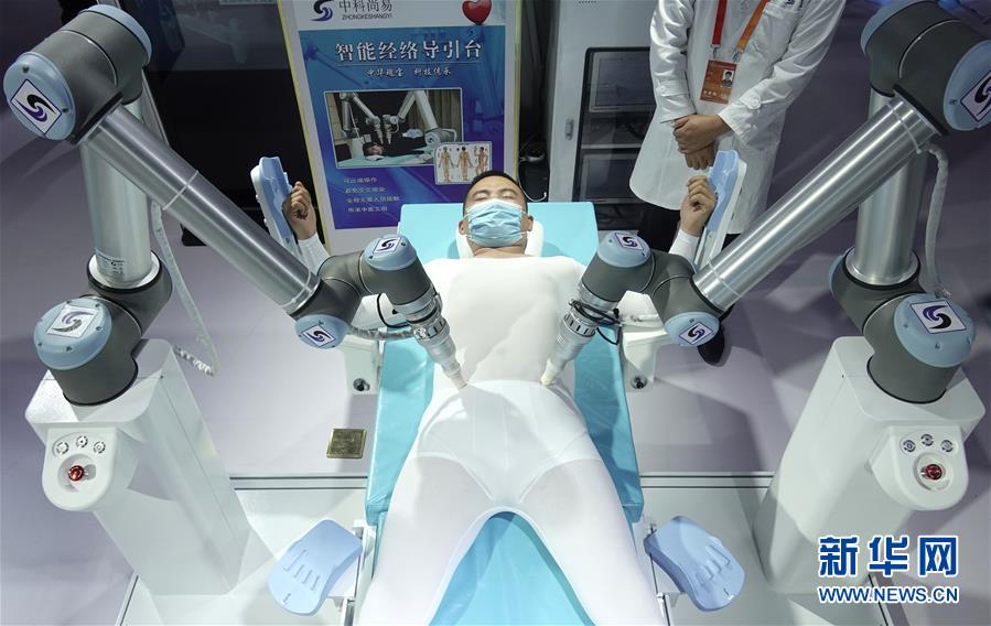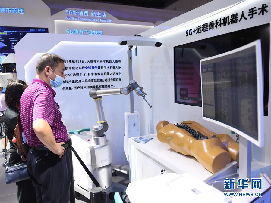 9月6日,参观者在服贸会上参观5G远程骨科手术机器人。 新华社记者 张晨霖 摄