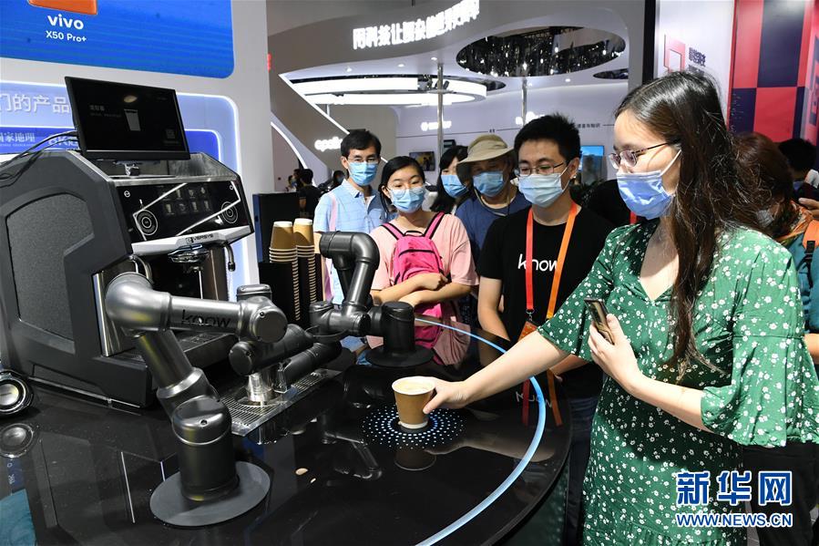 9月6日,参观者在服贸会综合展区与“咖啡机器人”互动。 新华社记者 任超 摄